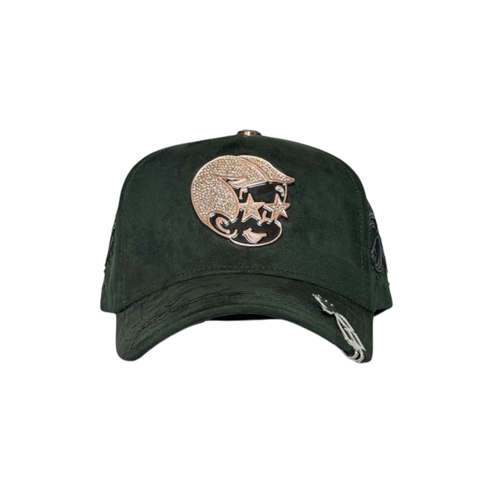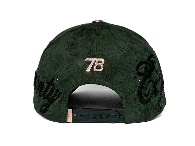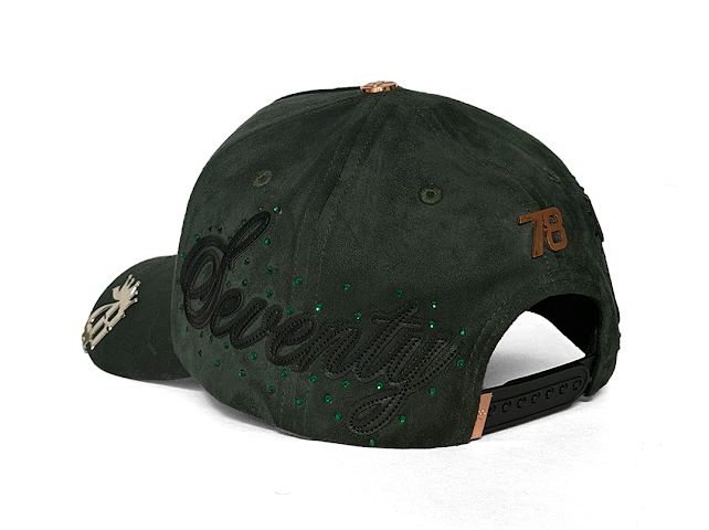 Esta gorra está confeccionada 100% en gamusa premium verde, ofreciendo un acabado suave, elegante y con presencia. Incorpora cueros auténticos, pedrería de alta calidad y detalles en rosa oro, logrando un equilibrio perfecto entre streetwear y lujo.